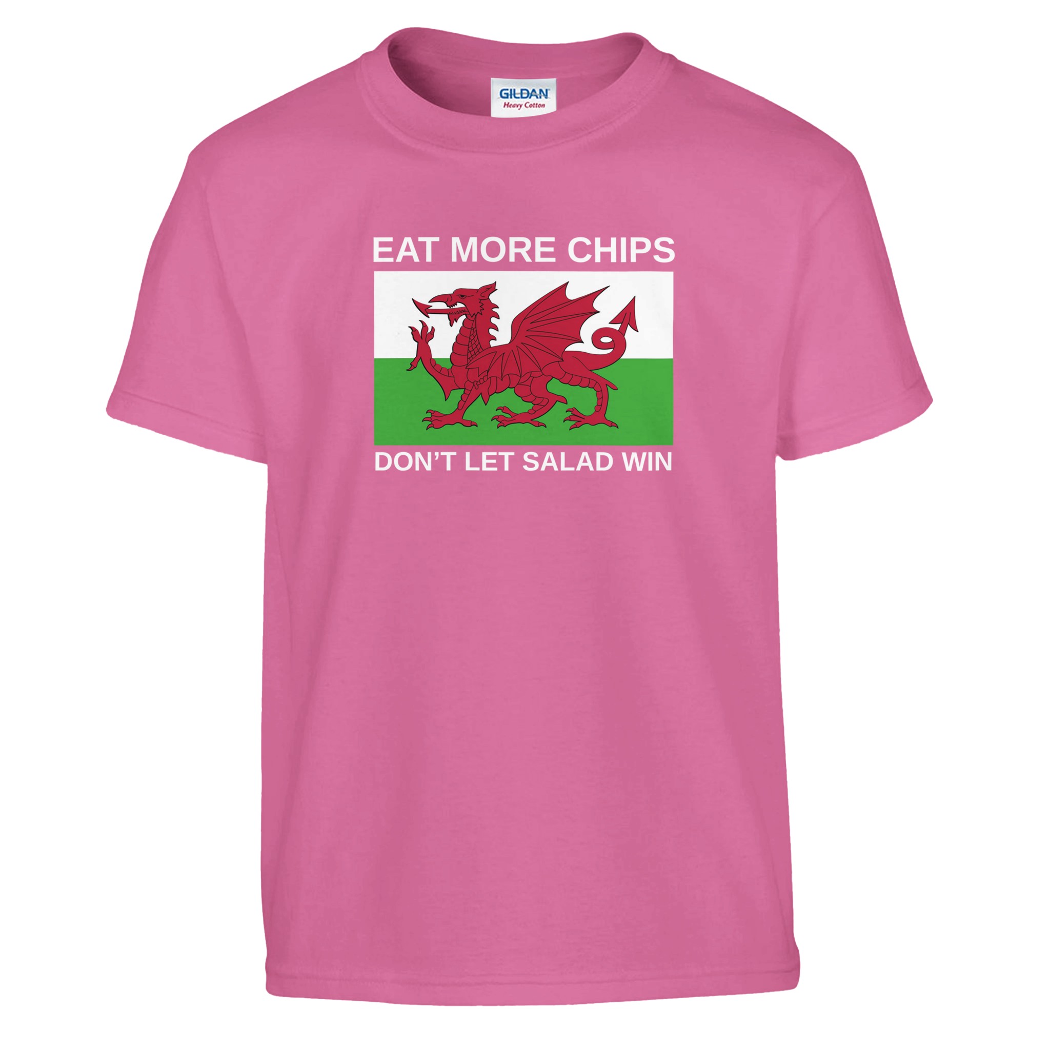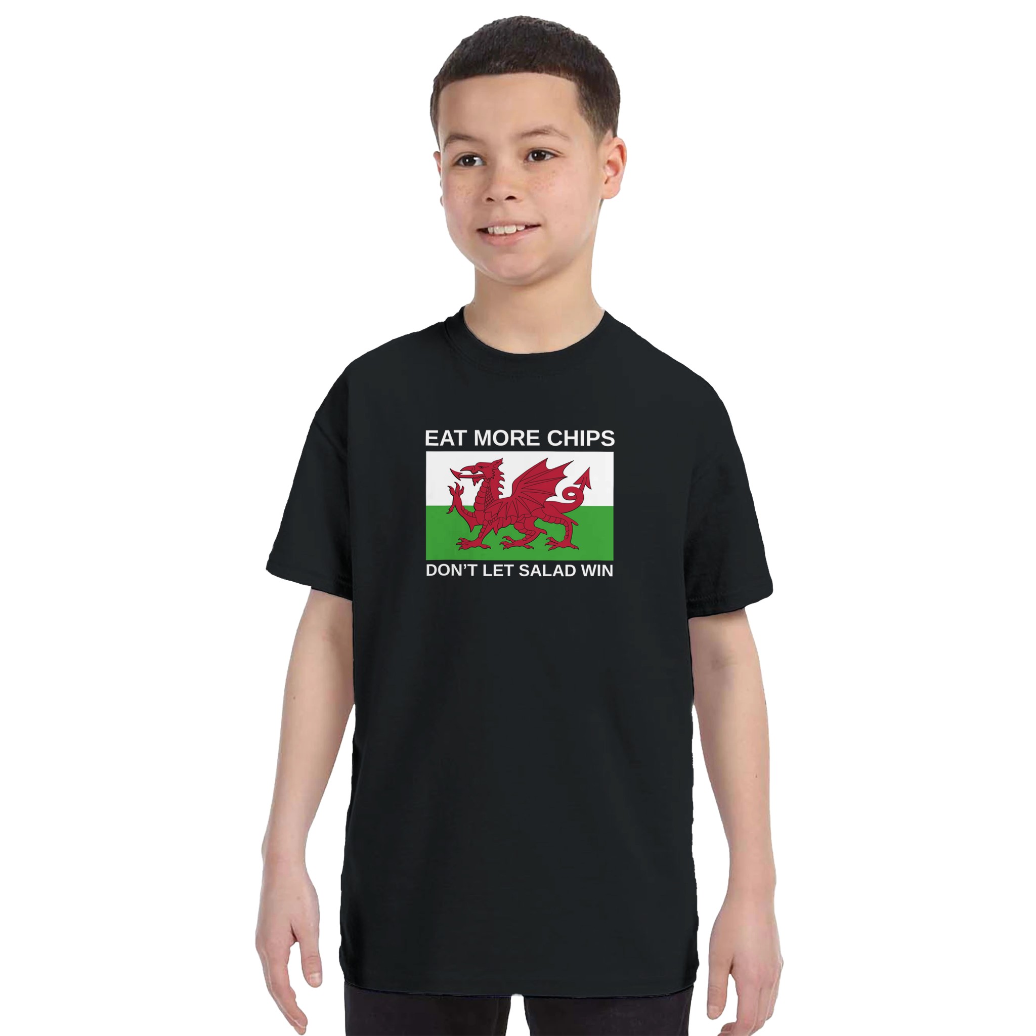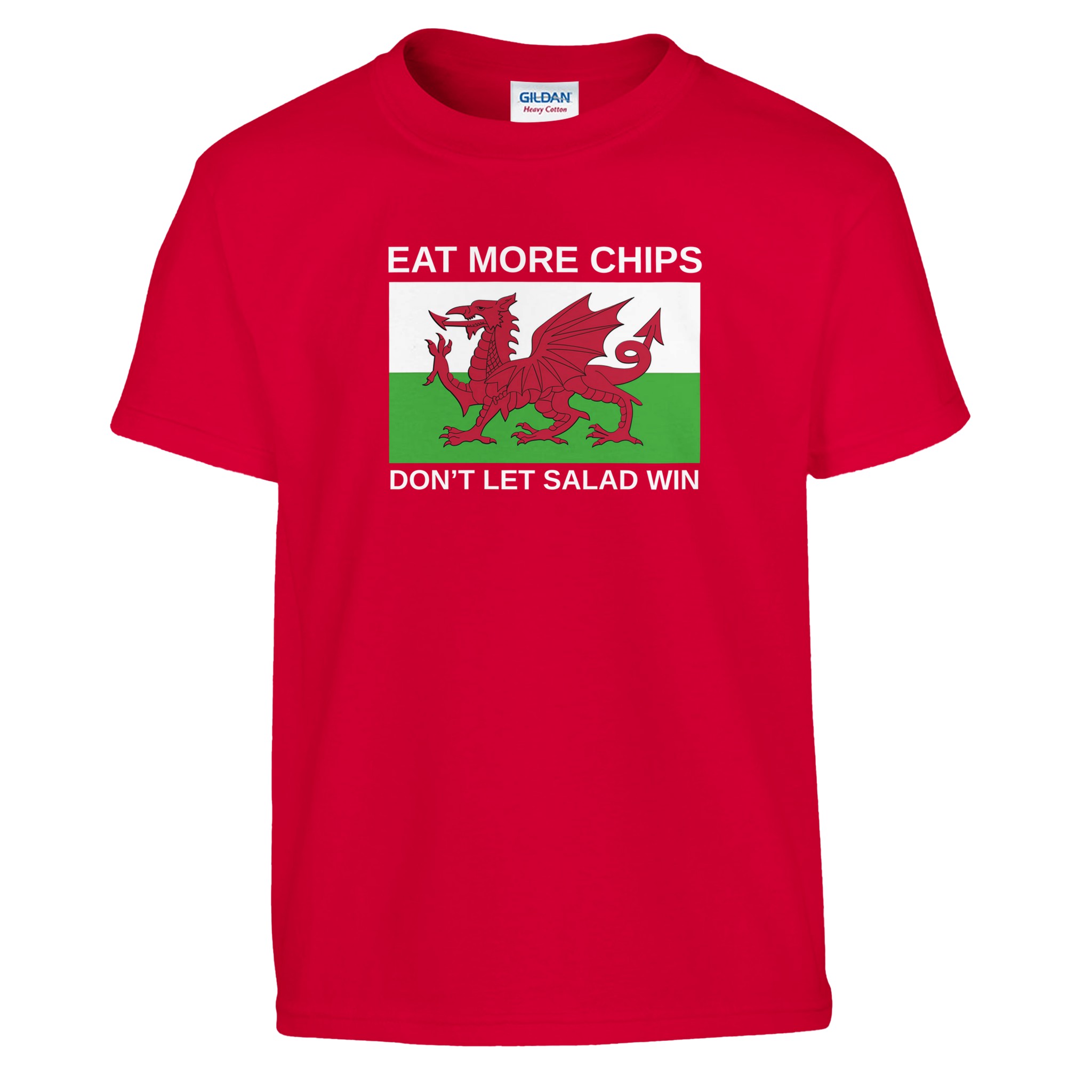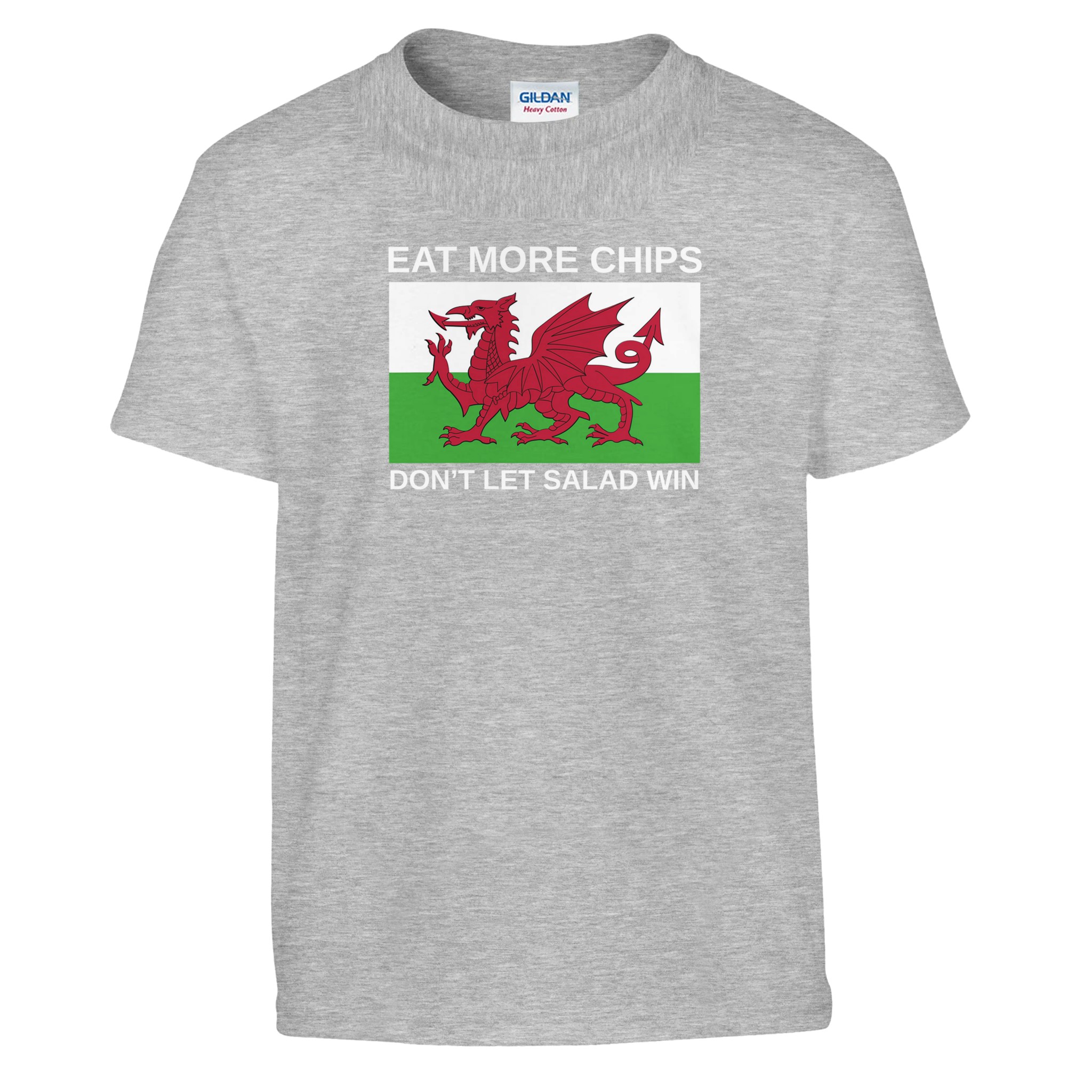 Eat More Chips – Don’t Let Salad Win! It’s an iconic flag seen at almost every Wales game for as long as I can remember. Every time I see it, it brings a smile to my face, quite possibly my favourite flag in football. Can’t believe it’s taken so long to put this Kids Eat More Chips T-Shirt together. Perfect for watching Wales home or away, get this Kids T-Shirt Today and do your bit to not let salad win!